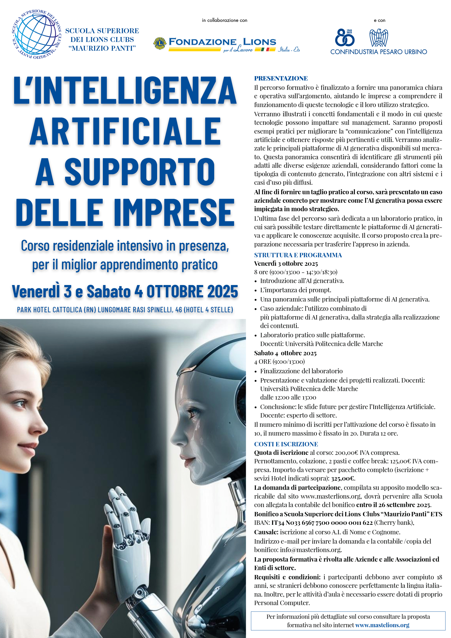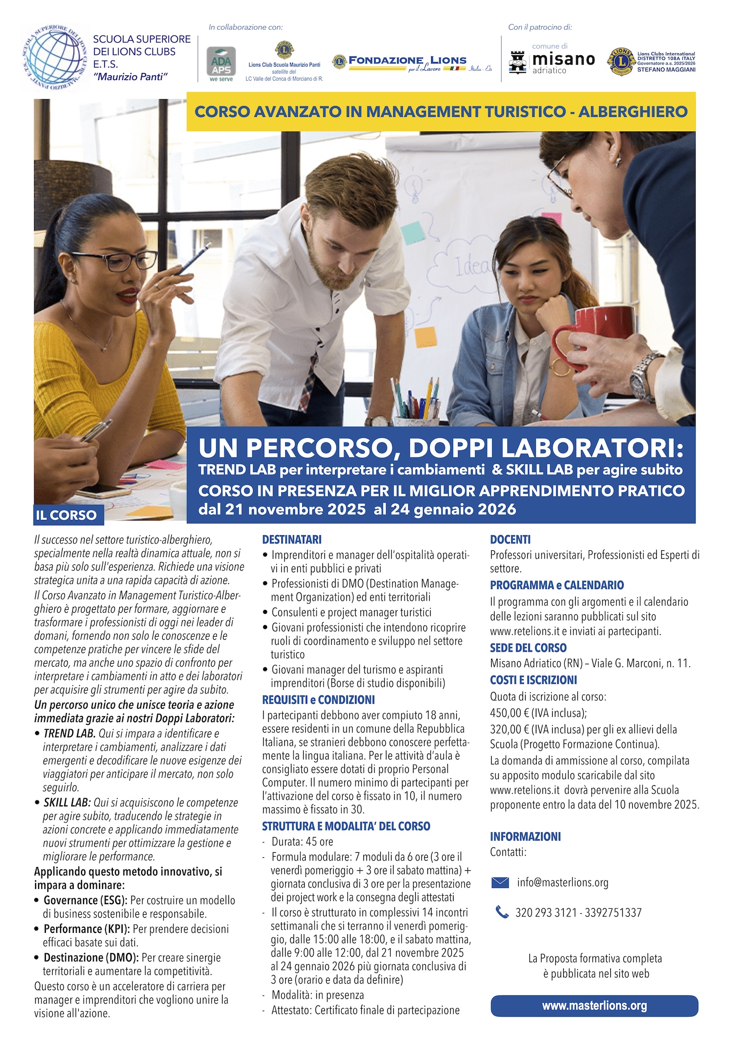 La Scuola Superiore dei Lions Club “Maurizio Panti” è stata istituita nel 2004 con la finalità di sostenere e favorire l’inserimento e il reinserimento dei giovani nel mercato del lavoro, ha sede legale e operativa a Misano Adriatico RN (nel seguito brevemente “Scuola”).